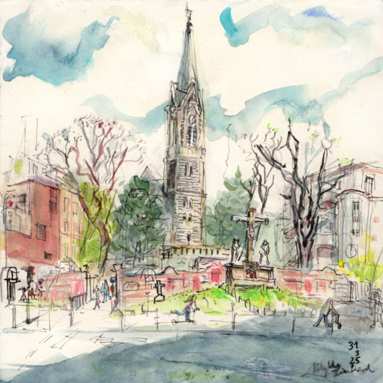 Was ich seit Jahren, bevor ich die Urban Sketches-Szene kennengelernt habe also schon gemacht habe: Reiseskizzen – nur einfach zu Hause in meiner Stadt oder wo auch immer ich gerade bin.