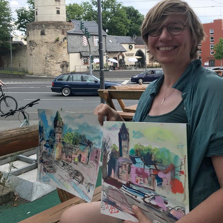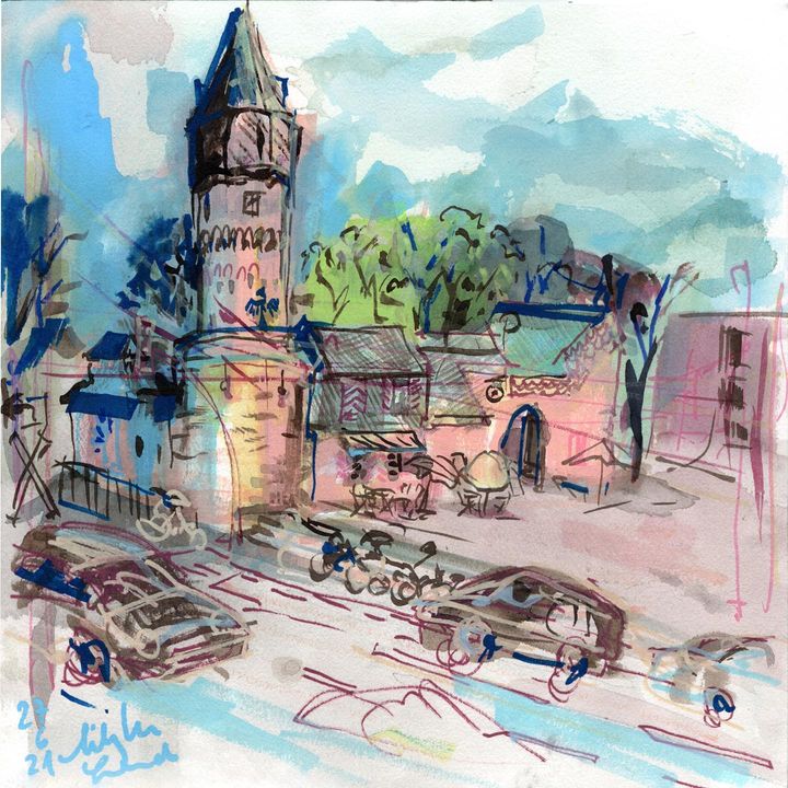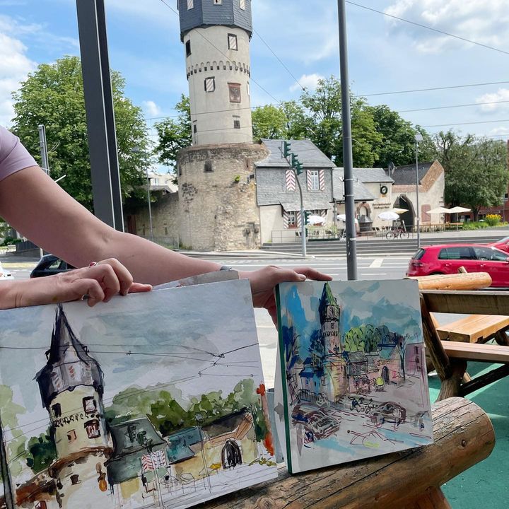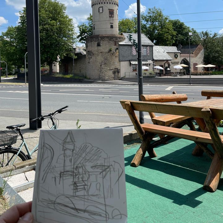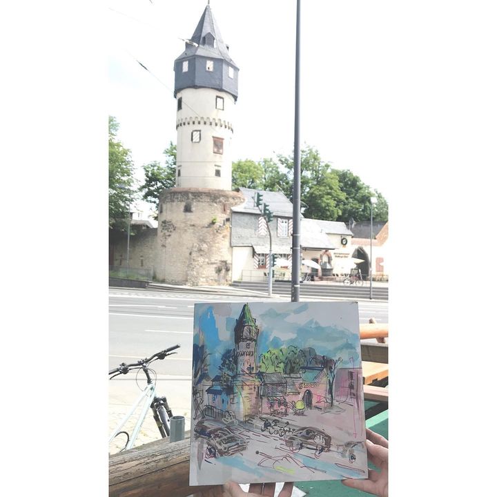 Friedberger Warte, Juni-Treffen zu den 4 Frankfurter Warten, den Türmen in der früheren Stadtmauer @uskrheinmain #uskrheinmain – gerade bin ich auf Farbexperimente aus… ein Zwispalt zwischen Linie und Fläche… 🙂 irgendwo auf dem Weg #posca #acrylicmarker #urbansketching #frankfurterwarten #friedbergerwarte #frankfurtammain