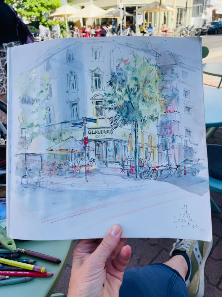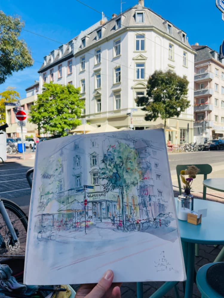 Blick auf das Café Glauburg von der gegenüberliegenden Straßenseite,  Café Frankfurt, Urban Sketch, Zeichnung Café Glauburg spätsommerlich mit Menschen und Schirmen draußen von der gegenüberliegenden Straßenseite von Sibylle Lienhard,  Altbaufassade, Aquarell, Baum mit Schattenwurf, Buntstift und Tusche,