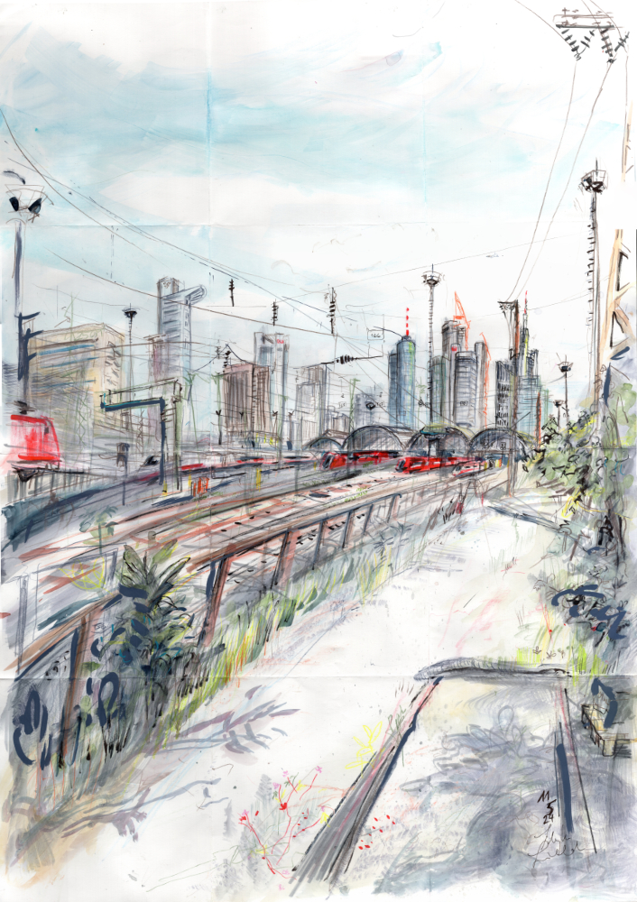 Teil des Werks „Am Hauptbahnhof“ gezeigt in der Ausstellung „Zeitzeugenschaft – Ein Erinnerungslabor“ im Historischen Museum Frankfurt, 19.9.24 bis 04.05.25, Format A1 59,4×84,1cm im Rahmen 70×100 cm