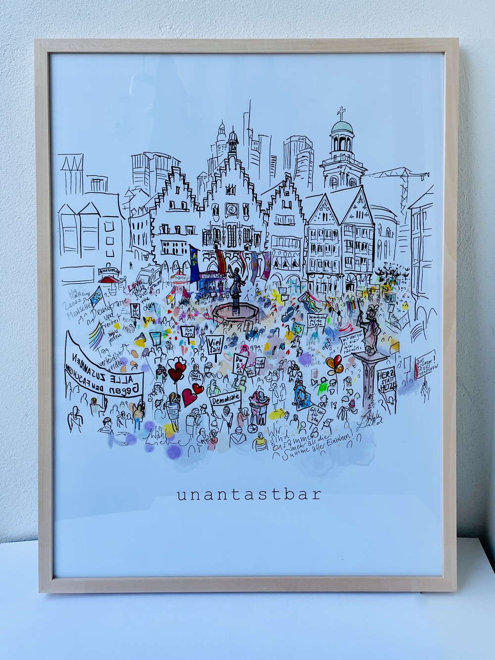 Ein urbaner Sketch, der die Demokratiebewegung im Herzen Frankfurts einfängt. Das Bild entstand live während einer politischen Demonstration, direkt aus dem Fenster des Römer-Bembel, und dokumentiert einen bedeutsamen Moment gesellschaftlichen Zusammenhalts.