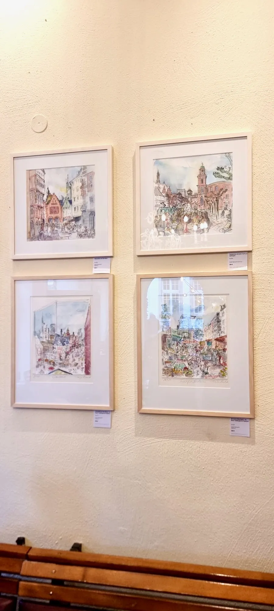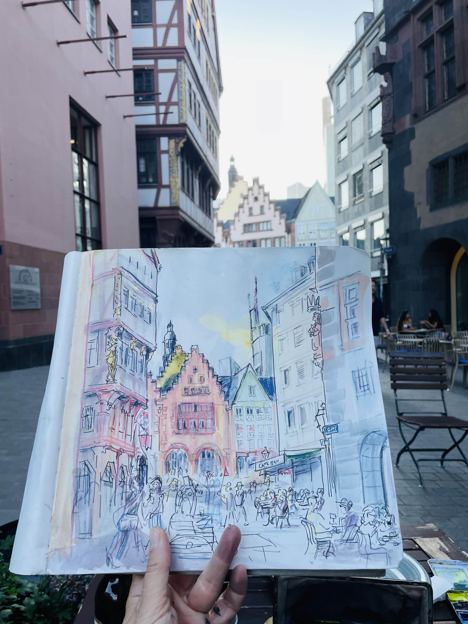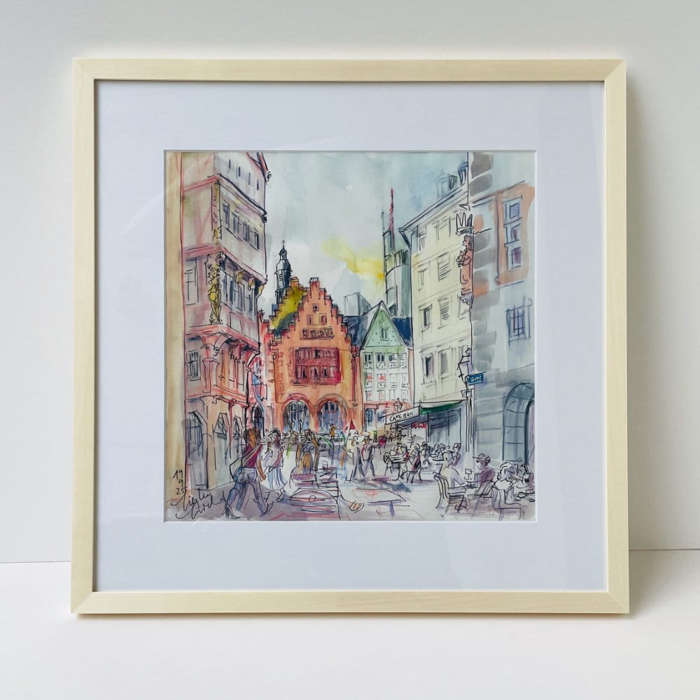 Blick zum Römer, über 50er-Jahre Römer und Treppengiebel-Römer Urban Sketch, Aquarell, Blick von der Gasse Markt Café Moenus auf Café-Bars Kunstverein, Buntstift, Commerzbankturm, Fachwerk, Fineliner vor Ort von Sibylle Lienhard, Madonna mit Kind, Monza, Risalite mit Hausfiguren Adam und Eva, Sonnenschein, Touristen, 19.9.2025 Abbildung Zeichnung mit Passepartout im Rahmen